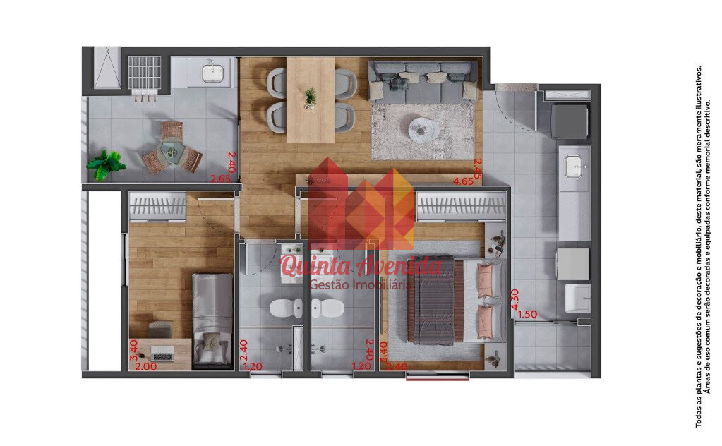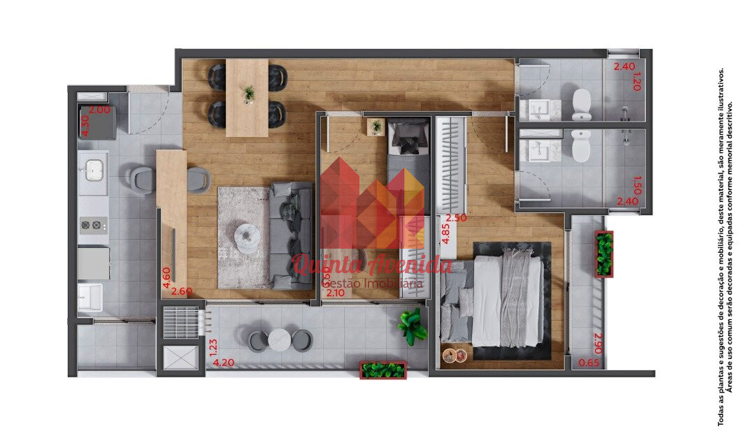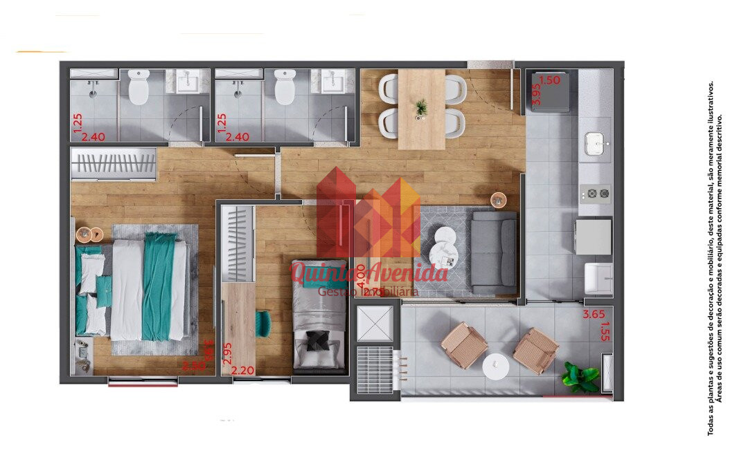 - Algumas unidades contarão com piso laminado e armários na cozinha, quartos e banheiros