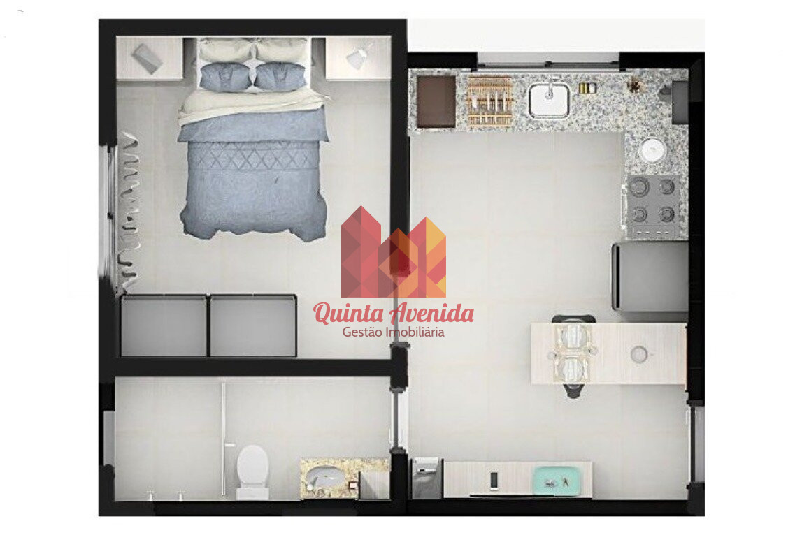 - Sala de estar conjugada com cozinha e área de serviço;