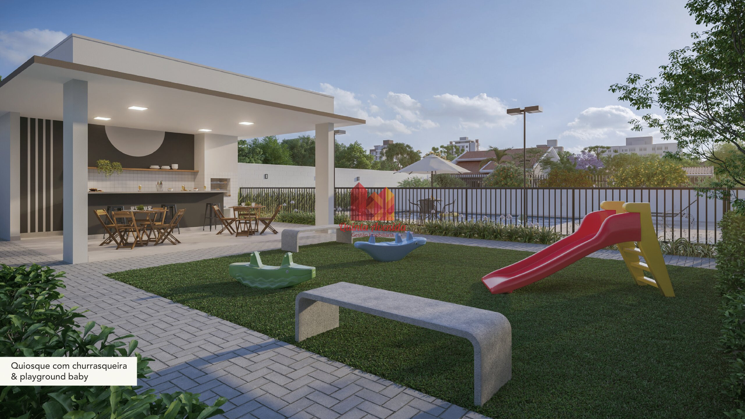 - Apartamentos de 46,84m² a 47,54m² de área privativa, com 2 dormitórios, sendo 1 suíte, sacada com churrasqueira e 1 vaga de garagem