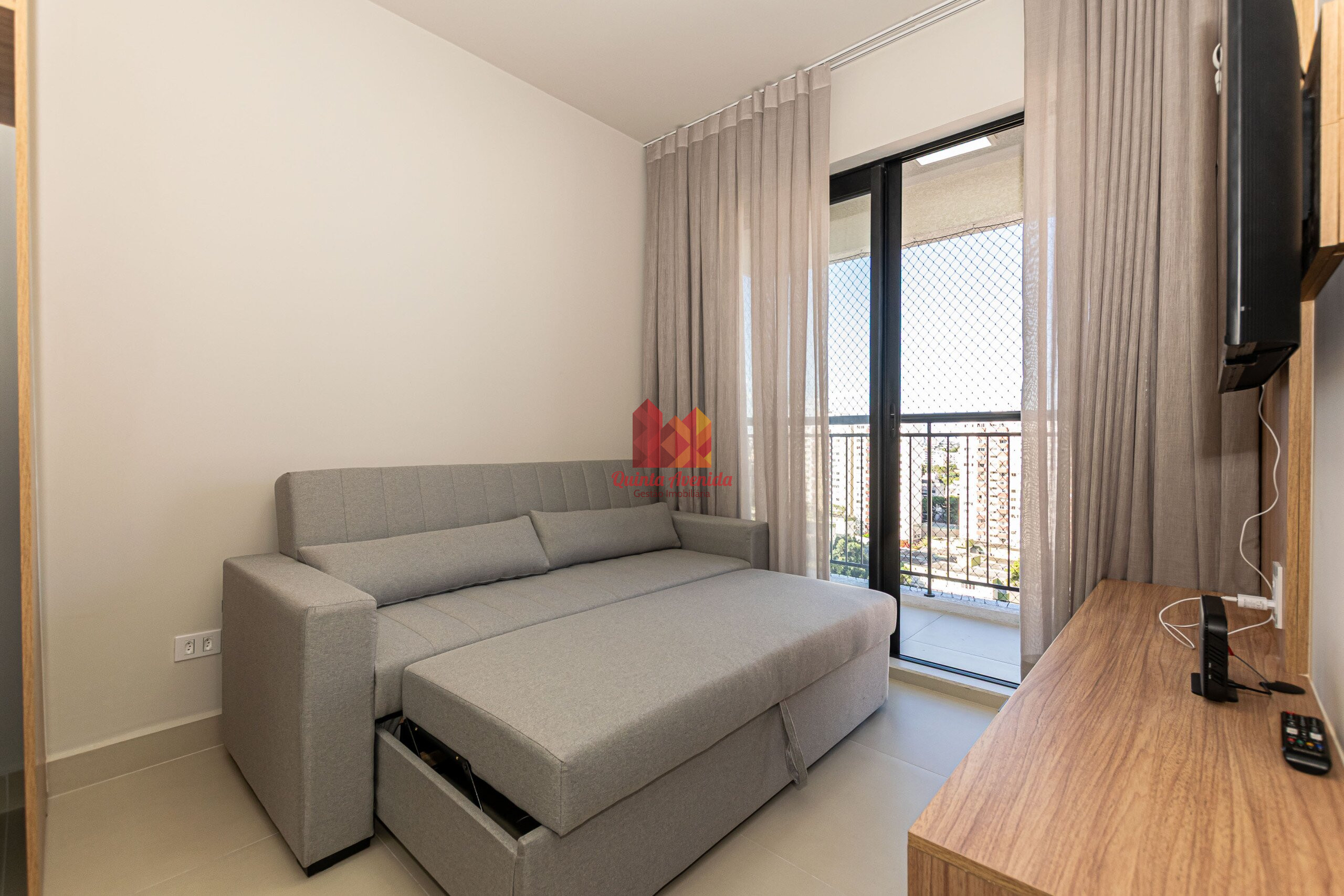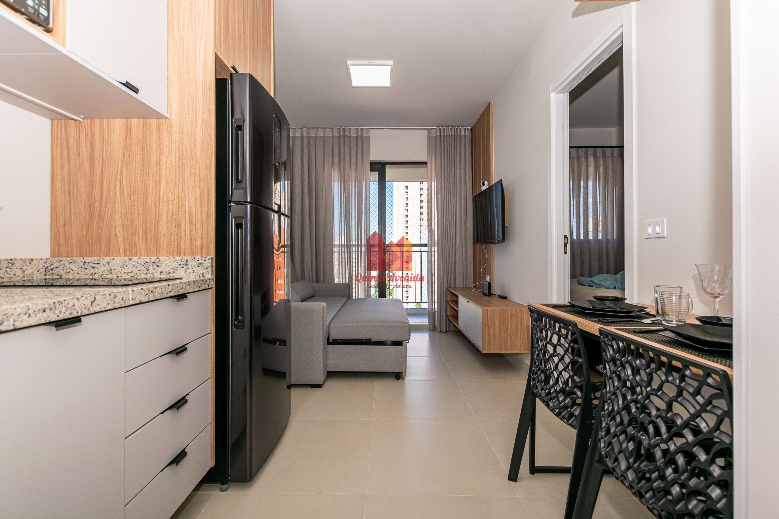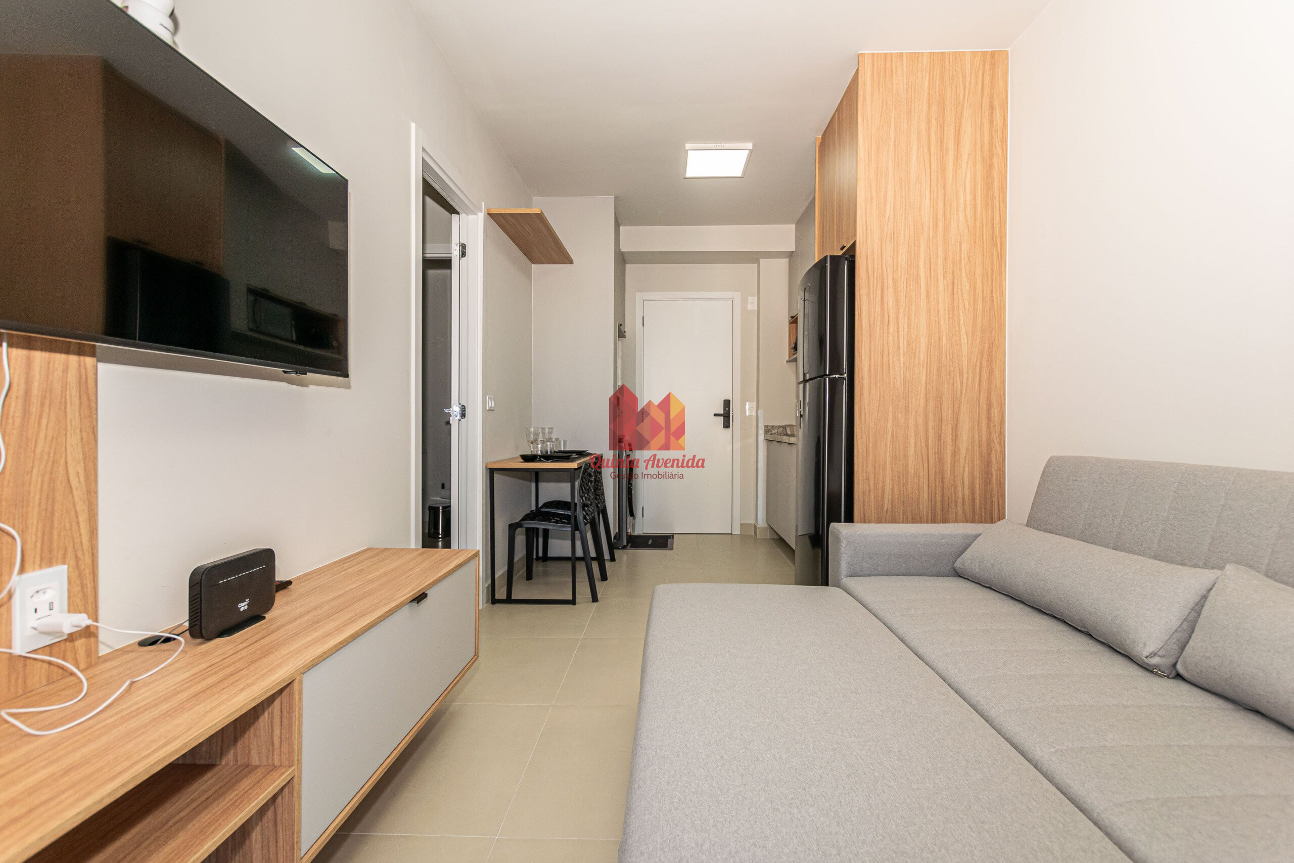 - Sala mobiliada e porta com fechadura digital;