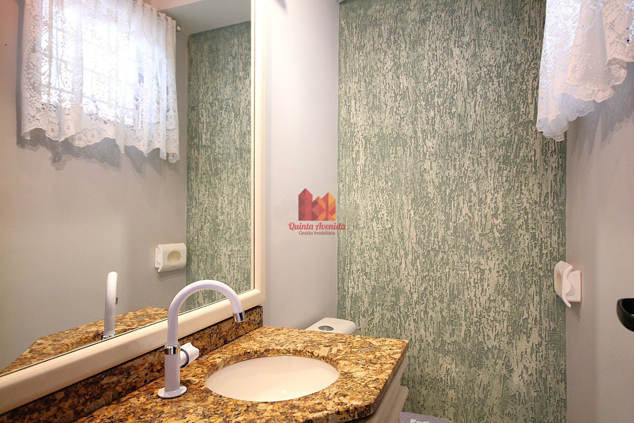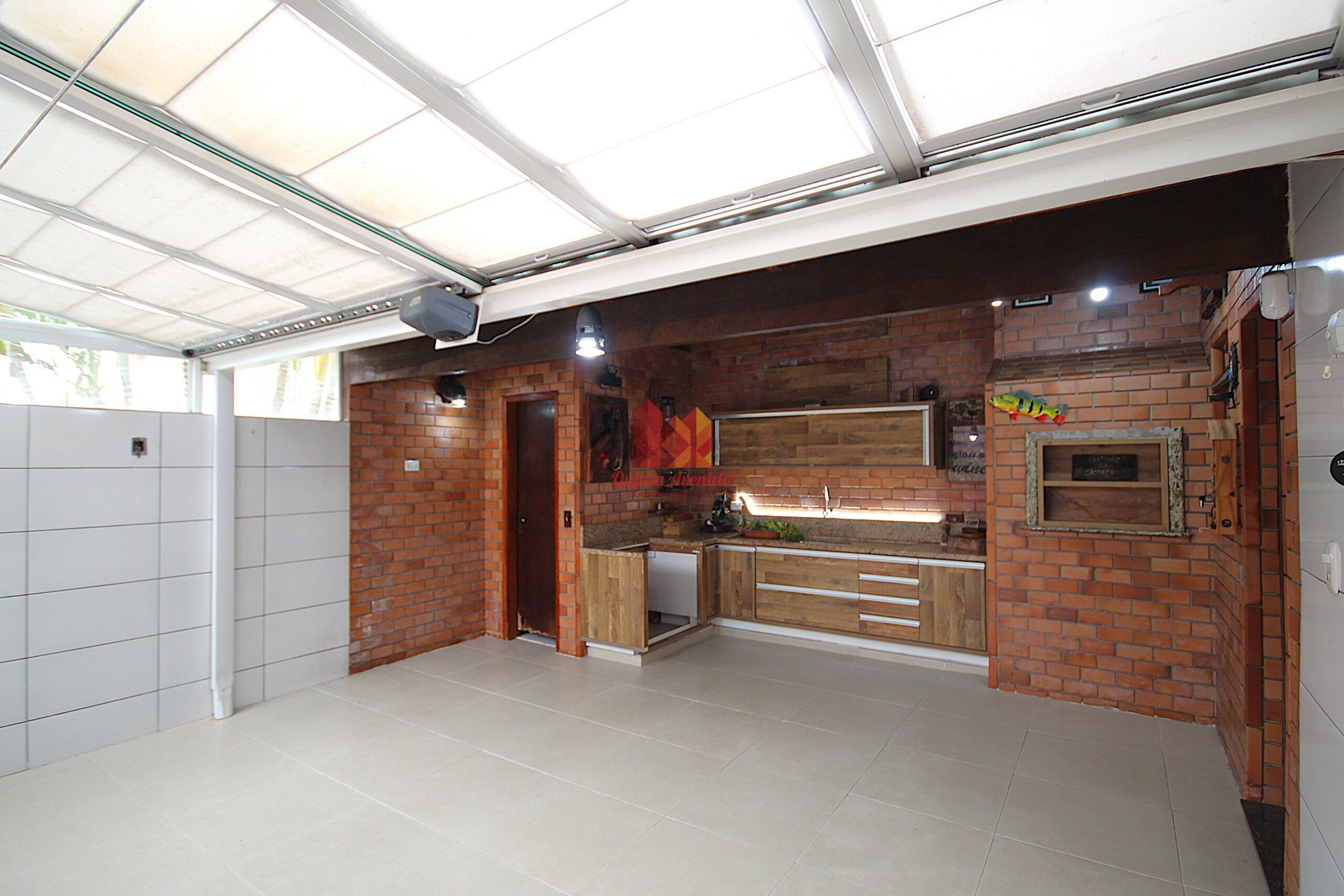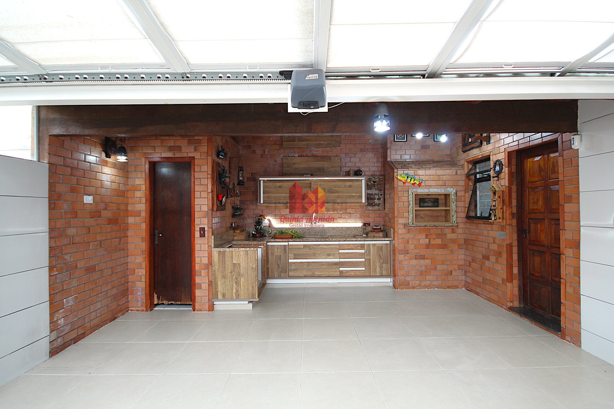 - Espaço gourmet com churrasqueira, cozinha com armários e lavabo