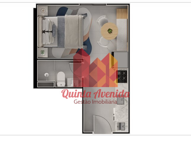 - Sala conjugada com dormitório, cozinha, área de serviço;